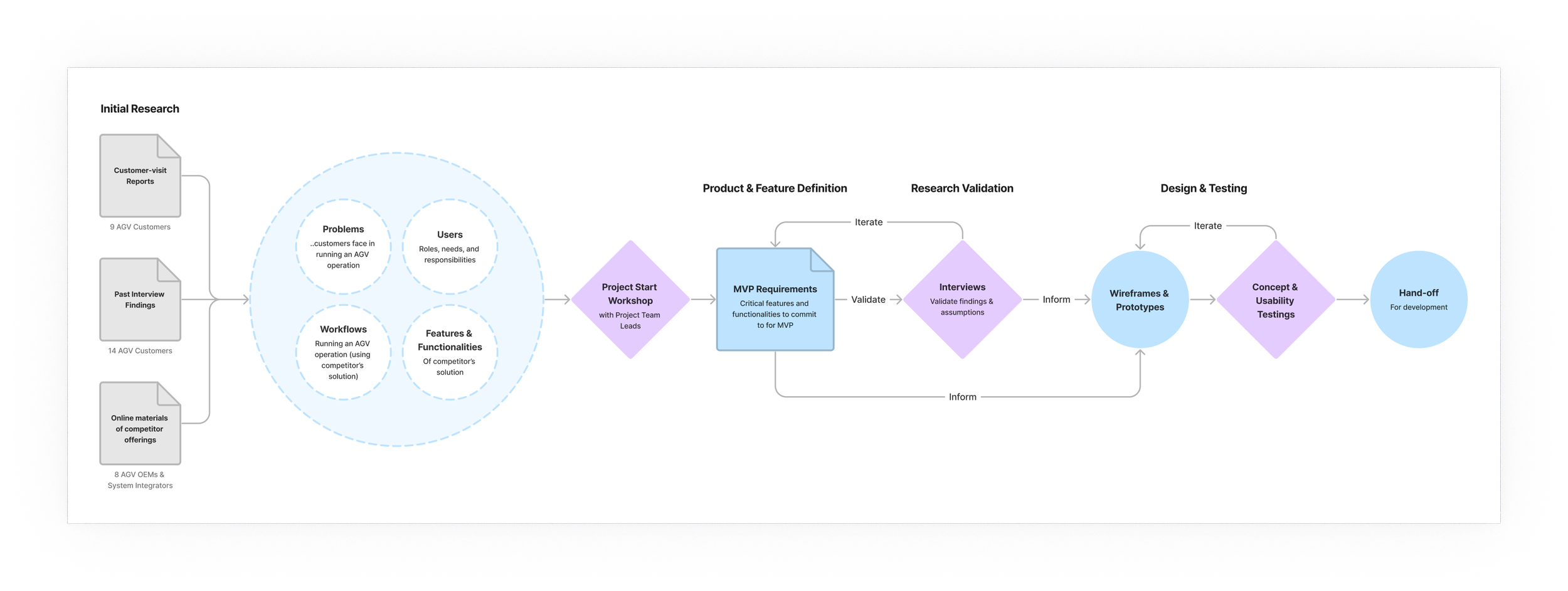 The findings highlighted the importance of telematics and B.I. solution for AGVs, and also allowed us to create a rough composite of the user types, workflows, and critical functionalities of the solution (all of which are validated at a later stage of the project). These findings were presented to the wider team, and later distilled into MVP requirements in a workshop that I facilitated.