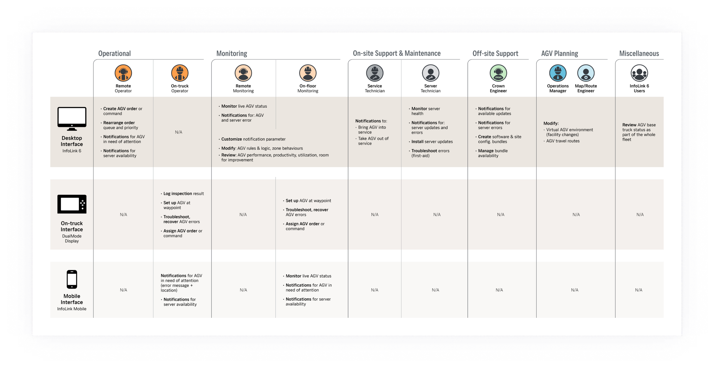 A customer-facing UI was not initially seen as a necessary part of the solution. Through research I was able to convince the project team and stakeholders that the solution requires some form of user interface for an AGV Supervisor that address their needs in looking after the operation. It was then added to my responsibility to lead the effort in designing the customer-facing UI, as an addition to Crown's 'InfoLink' fleet management platform.
