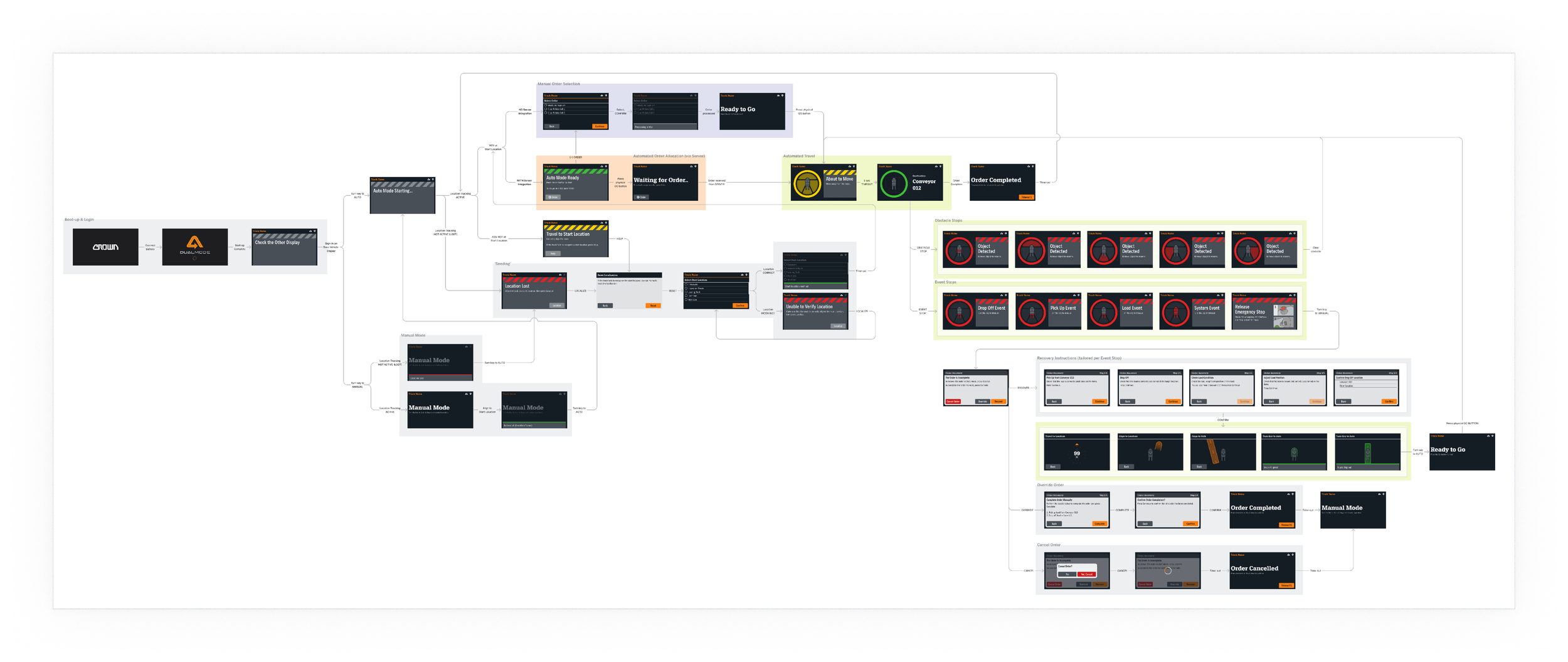 Another layer of challenge is the optional integration of Crown’s Automation Server into the AGV operation, which results in variations of on-truck user interaction even for a single AGV model around the start and end of an order. These are the workflows we need to facilitate through the UI.