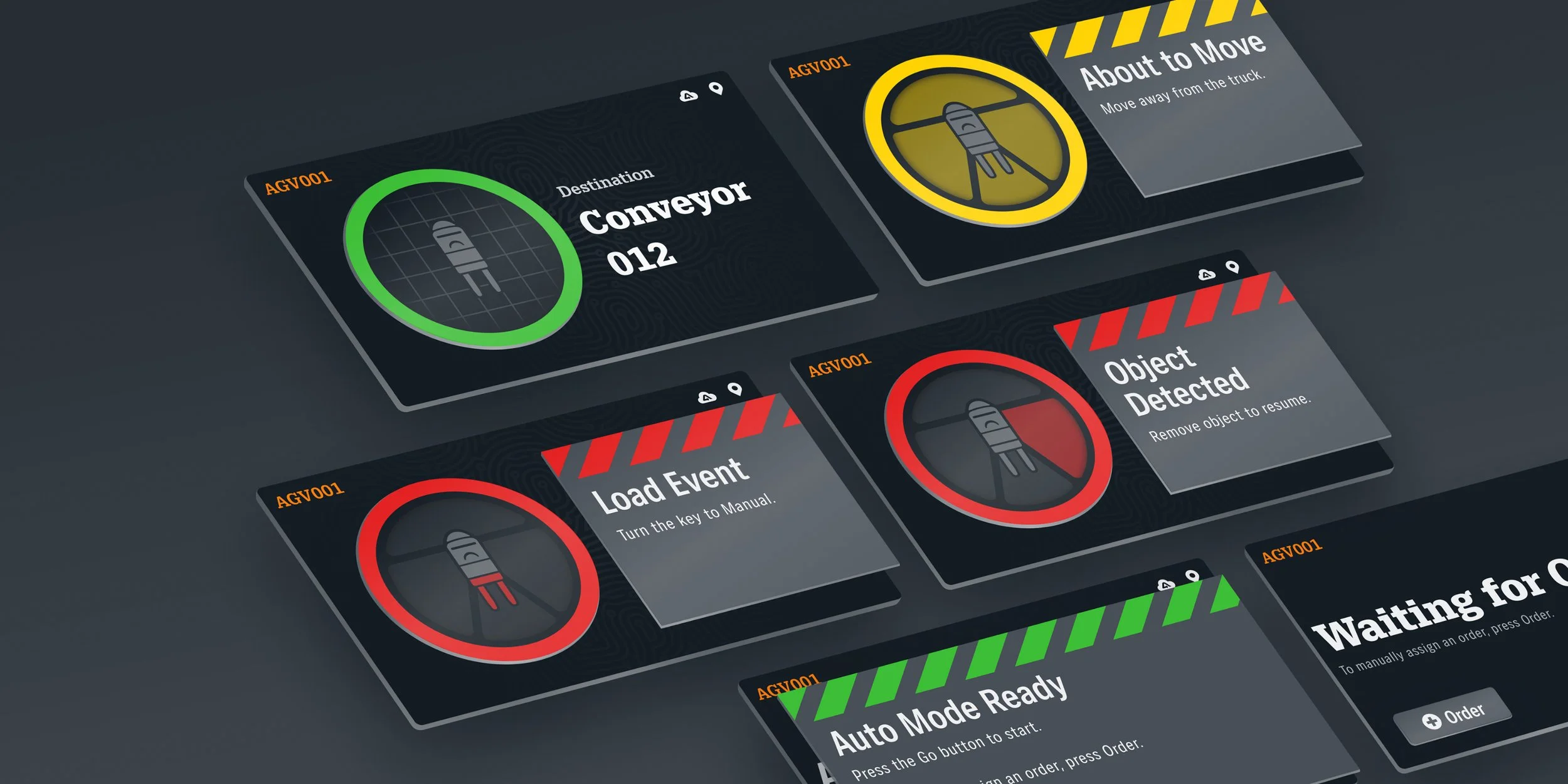 Universally understood colors used throughout the UI set the tone for current AGV condition while bold and concise messaging clearly communicates what the vehicle is experiencing.